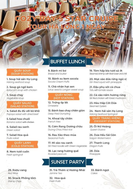 - Bữa ăn trưa Buffet trên tàu theo Chương trình với tour hạ Long.
