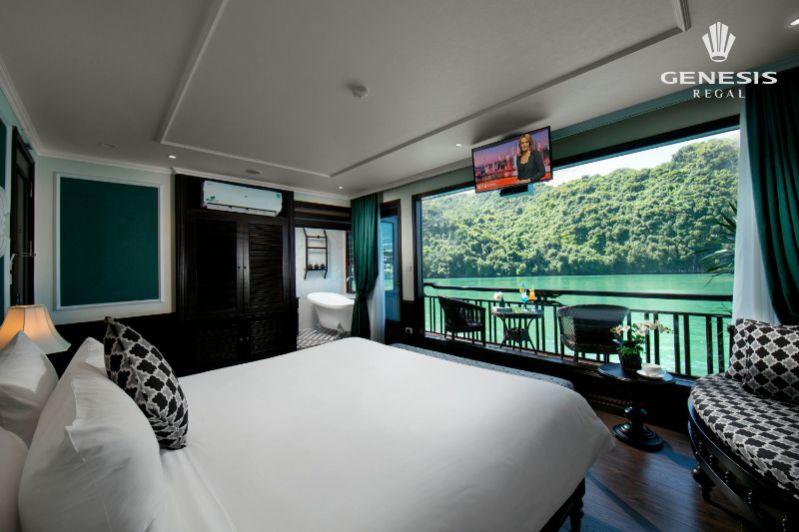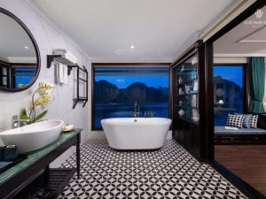 - Phòng nghỉ trên du thuyền sang trọng tiêu chuẩn 5 sao (Tất cả các phòng đều có ban công riêng, full view hướng biển và nhà tắm đứng + bồn tắm nằm, wifi và truyền hình vệ tinh….)