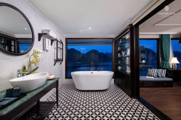 - Phòng nghỉ trên du thuyền sang trọng tiêu chuẩn 5 sao (Tất cả các phòng đều có ban công riêng, full view hướng biển và nhà tắm đứng + bồn tắm nằm, wifi và truyền hình vệ tinh….)