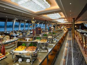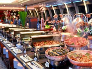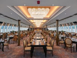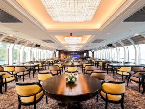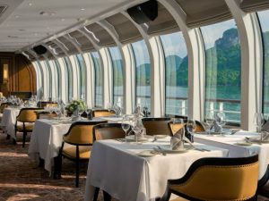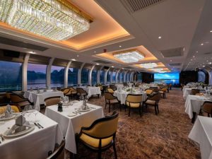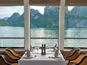 Thưởng thức thực đơn hảo hạng trong khi du thuyền đi ngang qua các danh lam thắng cảnh nổi tiếng như Thiên Cung và Hang Đầu Gỗ. Những nguyên liệu tươi ngon, được chọn lựa và chuẩn bị kỹ lưỡng dưới bàn tay của những đầu bếp tài ba trong không gian nhà hàng sang trọng với tầm nhìn vô tận ra kỳ quan thiên nhiên.