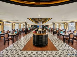 Quý khách quay trở lại tàu. Bữa trưa thượng hạng với các món tinh hoa ẩm thực Á – Âu sẽ được phục vụ tại nhà hàng Sea Breeze hoặc Bayside Delight khi du thuyền di chuyển qua các khu vực nổi tiếng của Vịnh Hạ Long: Hang Luồn, Hồ Động Tiên, Hang Trống, Làng chài Cửa Vạn, Hang Mê Cung.