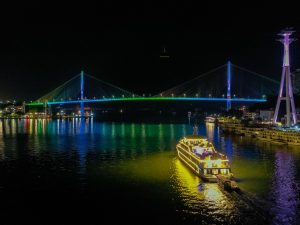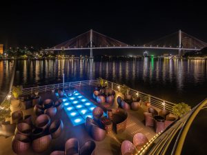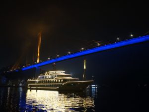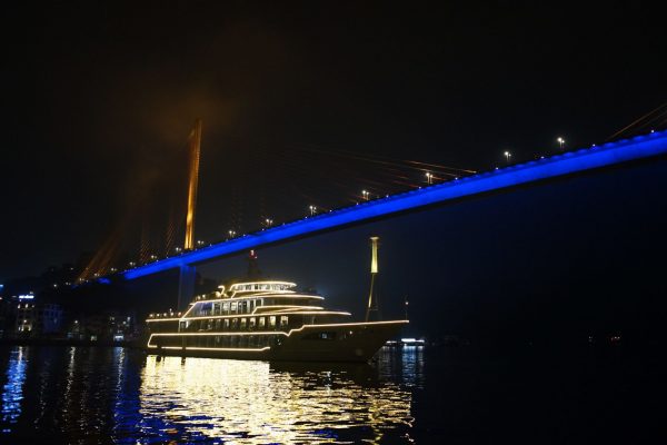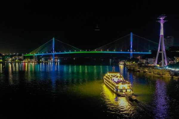 Quý khách sẽ có thời gian ngắm nhìn khung cảnh lung linh tuyệt đẹp của thành phố Hạ Long về đêm trong khi tàu Sea Octopus di chuyển trong vịnh, đưa quý khách đi qua những địa điểm nổi tiếng như cầu Bãi Cháy, Vòng quay mặt trời, núi Bài Thơ, bảo tàng Quảng Ninh, cung Cá Heo.