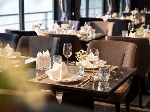 - Nhà hàng 5 sao được bố trí ở tầng 1 và tầng 2 của du thuyền với thực đơn Á, Âu tươi ngon, hấp dẫn, sức chứa lên tới 199 khách, Toàn bộ nhà hàng được thiết kế cửa kính giúp khách hàng có thể ngắm toàn vịnh trong suốt quá trình tham quan và dùng bữa.