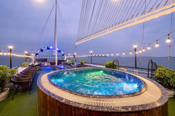 14:00: Tại khu vực Hang Luồn, du khách có thể chèo kayak/thuyền nan – môn thể thao được yêu thích nhất của giới trẻ hoặc lựa chọn nghỉ lại trên tàu, vui chơi tự do và sử dụng bể sục Jacuzzi.
