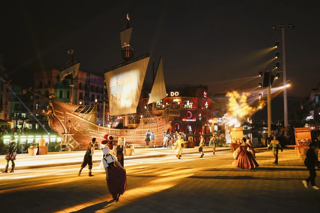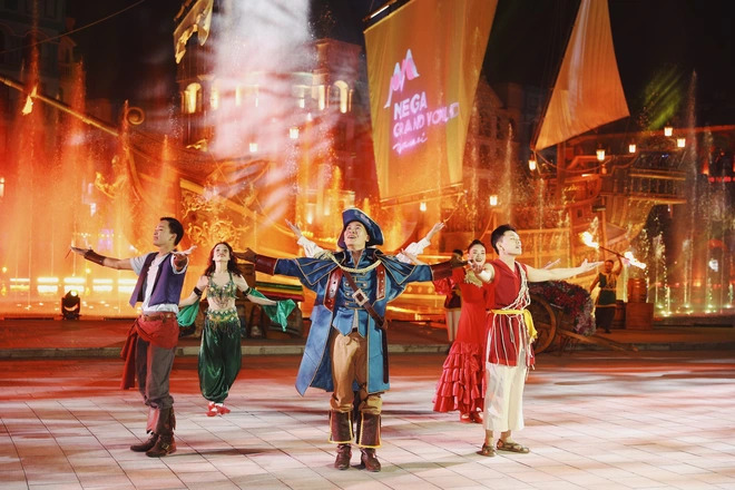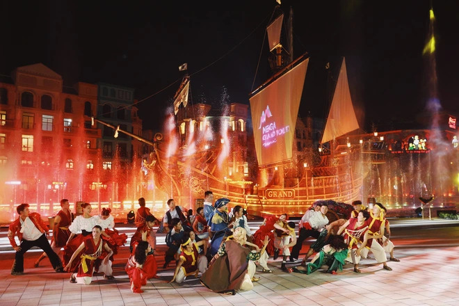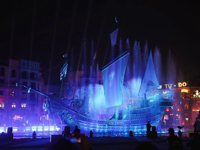 Nếu như ban ngày, Mega Grand World mang đến vẻ đẹp hiện đại với dòng kênh Venice thơ mộng, tươi sáng thì khi lên đèn lại là khung cảnh xa hoa, tráng lệ mà nổi bật nhất chính là vở diễn thực cảnh kết hợp công nghệ mapping 3D trên sân khấu thuyền The Grand Voyage. Show diễn tái hiện một hải trình giao thương từ châu Âu hoa lệ, băng qua con đường tơ lụa trên biển, di chuyển qua 5 đại dương lớn, khám phá vùng đất phía biển Đông với thương cảng phồn hoa Hội An – Việt Nam trong truyền thuyết.